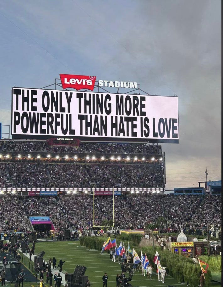 I adore all that, and I adore the million times I’ve already seen that Jumbotron image passed around, the one about love rather than hate. And also, I appreciate, in a different way, that it’s impossible to share images of that Jumbotron without the insidious reminder that the stadium, like the halftime show itself and like so much of our daily lives, was brought to us by a line item in a multinational corporation’s marketing budget.