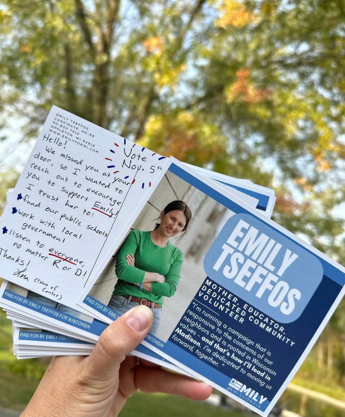 “Hi, I’m Emily Tseffos. I’m running for Assembly here in the 56th District. I’m at the very bottom of your ballot, so it’s the kind of race that if I don’t come meet you face to face, you may never hear about. That’s why I’m out here doing everybody’s favorite thing… talking politics with strangers.”
