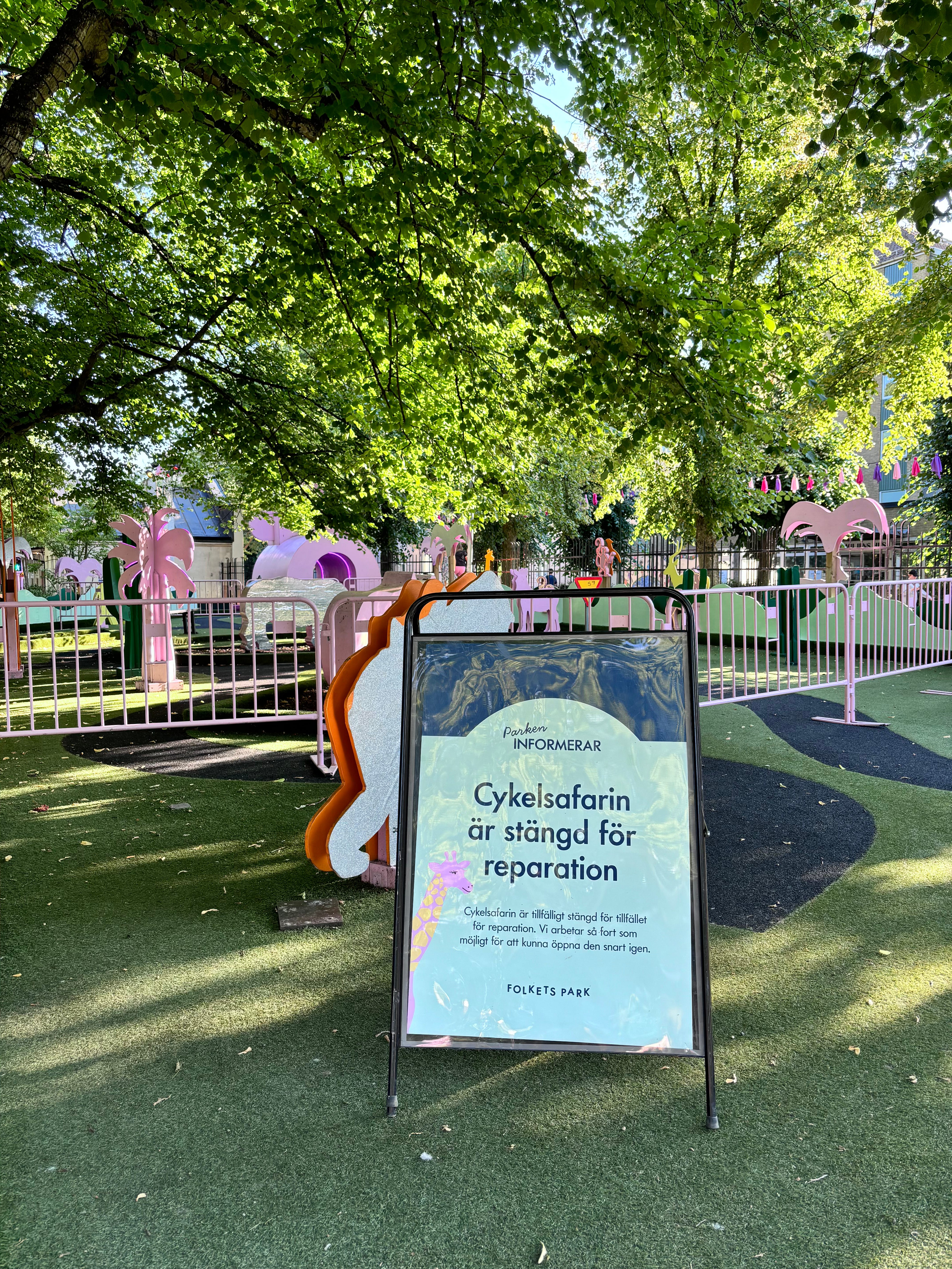 This sign does not, in fact, say that the children’s cycle safari play area (which is adorable, by the way- there are free bikes and scooters where kids get to ride around a mini animal-heavy cityscape) is closed for reparations, but I like pretending that it does. We’re not free (at the children’s cycle safari) until we’re all free (at the children’s c…