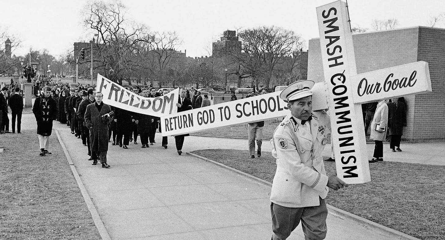 All the God-killing finally comes to a head with the Warren Court. Hegseth acknowledges that you, the viewer, might think the Warren Court were good guys because of the Brown vs. Board decision. In actuality, they were a bunch of craven nation-destroyers who, in a triumvirate of Very Bad Rulings, ran roughshod over the constitution and invented the myth of Church/State separation.