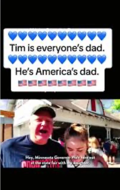 I have read that people wish that Tim Walz was their dad. I have read that Tim Walz reminds people of their dad. I have read gushing tributes to the way he talks about how he’s been changed by his daughter Hope’s prodding on issues like gun rights or what he and his wife Gwen have learned from their son Gus navigating the world with disabilities. I have read, heartbreakingly, that there are a number of White people with Boomer and Gen X fathers who say that Tim Walz reminds them of who their dad was before they started mainlining Fox News and became a misanthropic grump. I can tell that there’s so much embedded in even the quickest tossed off joke— a longing, a nostalgia, a thirst. For what? For earnestness? For male vulnerability? For a public figure that very well may wake up in the morning thinking only about focus groups and polling but who we can at least imagine wakes up thinking about the text he got from his daughter, about whether she’s safe, about whether she’s changing her oil frequently enough?