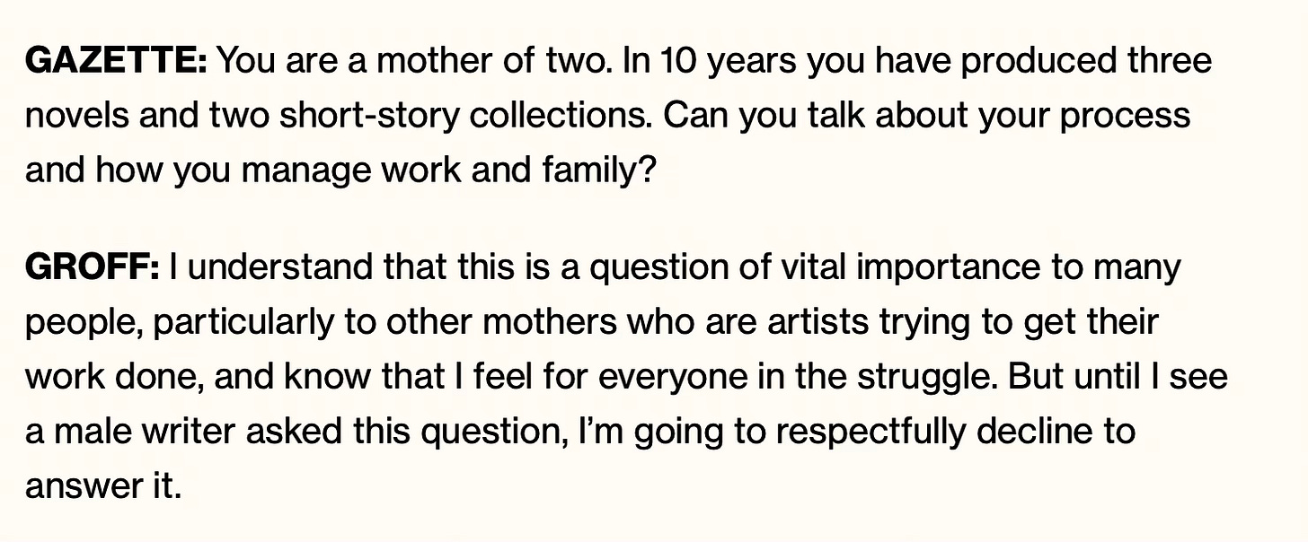I didn’t answer out loud, because I was too busy going down my own rabbit holes. I thought about how rare it is that I’m asked to think about being a dad outside the four walls of my house. I thought about the quote that the author Lauren Groff gave in 2018 when interviewed by the Harvard Gazette. My friend Lyz Lenz (of