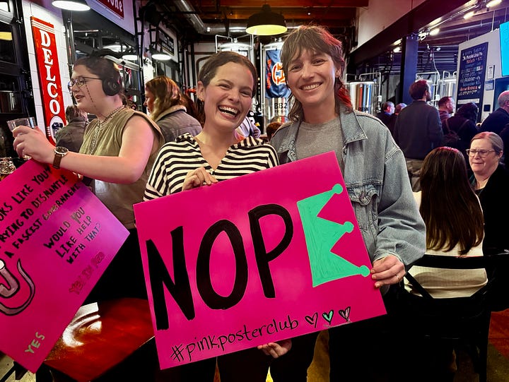 If you ask Emily Miller and Savanna Essig-Fox, they’ll assure you that they aren’t special. They’re being overly humble. They are, I can assure you, brilliant, sophisticated and truly excellent at what they do. But they’re not lying. The most beautiful thing about Pink Poster Club is that you too can start your own version of it tomorrow. Just text a friend. Say “I know this must sound crazy, but what if…” Then do it, together. First one time, then again. Each time, extending the invitation to a few more people. Each time, being immensely grateful that they showed up. Each time, with the promise that there will be a next time.