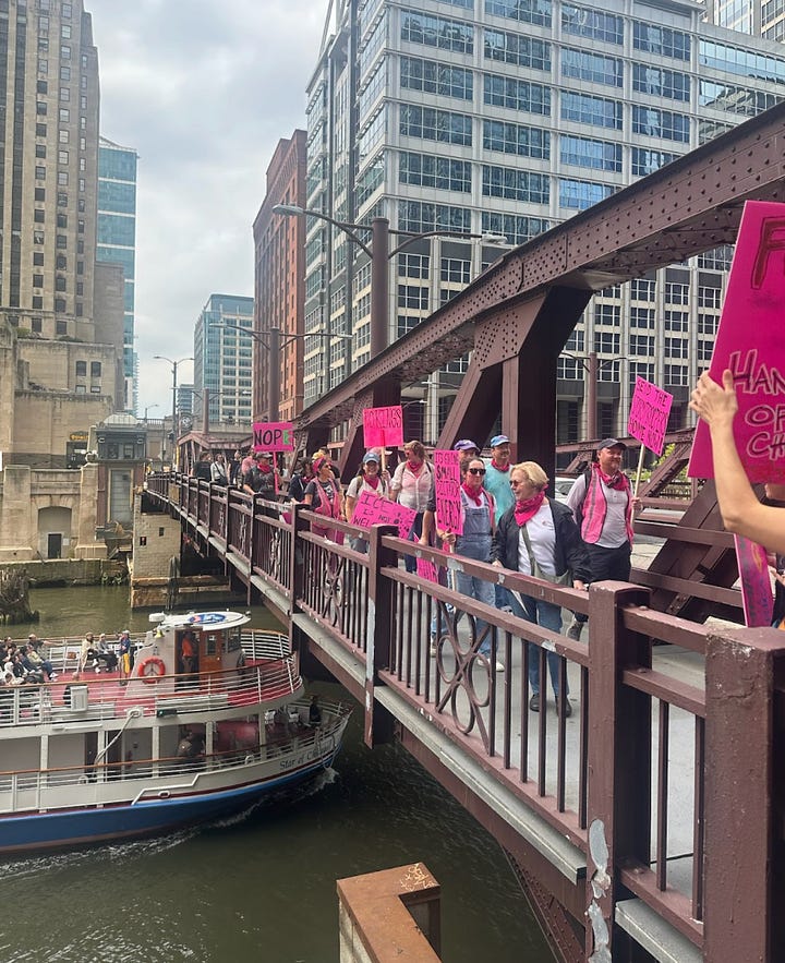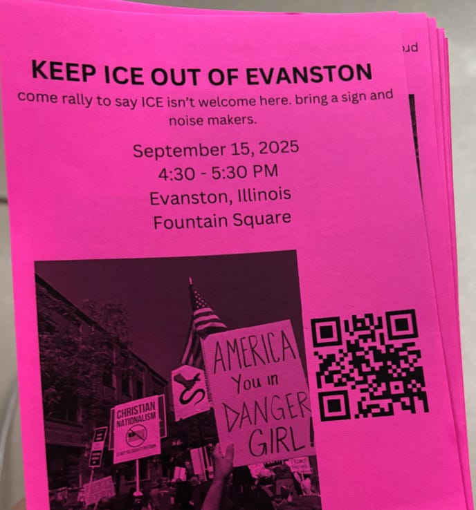 That’s the thing about keeping a community both connected and in motion. History comes for ordinary people all the time. So thank goodness that—when the Trump administration’s war on immigrants descended on Chicagoland this fall— Pink Poster Club members were ready. They’d be the first to tell you that they weren’t the leaders of the immigration rights movement in their city, nor were they its only active volunteers. But it’s undeniable that they were a key backbone. When the gun thugs circled schools with automatic rifles, poster clubbers were there, filming. When the Black SUVs terrorized landscaping crews, they were there too, blowing whistles, spreading the word in two languages. When more volunteers were needed to fill in shifts, Miller and Essig-Fox put out call after call, and each time, Evanstonians answered.