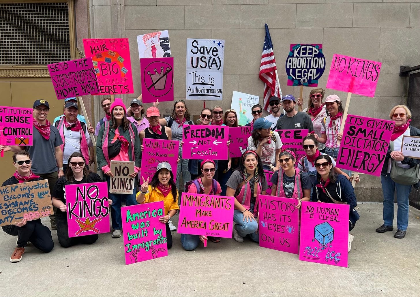 As of this writing, ICE is still in Chicago, but the regime’s performative show of force has temporarily shifted to warmer cities. If Pink Poster Club was only capable of mobilizing in the most heightened moments, you’d have expected its event last week to be one of its smallest. After all, the holiday season has arrived in full force. Essig-Fox and Miller had already asked so much of their neighbors. The cortisol rush that comes from fascists openly patrolling your town’s schoolyards had subsided.