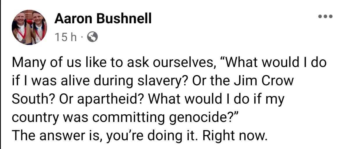 This: “The empire, in turn, is rooted in hopelessness. It has no language of caring, just force. And so it has no response to the human being on fire except to point a gun at the flames.”