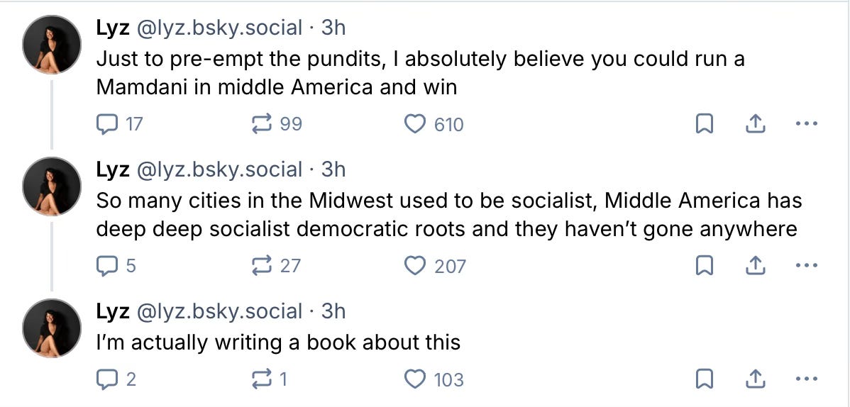 I hope that happens, but I’m nervous (and with good reason, given the Democratic establishment’s timidity and/or hostility in response to the campaign). Ever since Mamdani’s stunning primary victory this summer, there have been efforts to explain away his popularity. Maybe he only won because Cuomo was such a terrible candidate. Or maybe it was TikTok, or trust fund gentrifiers, or because Gen Z is lonely and wanted something to do. The most common explanation, though, has been that New York City is different from the rest of the country. More woke. More affluent. More educated. That was essentially the case that Ezra Klein made in his video op-ed in advance of the election (as an aside— I truly don’t intend to keep writing about the guy, but for now I just can’t quit him). Democrats can run candidates like Zohran in New York, the argument goes, but not the heartland.