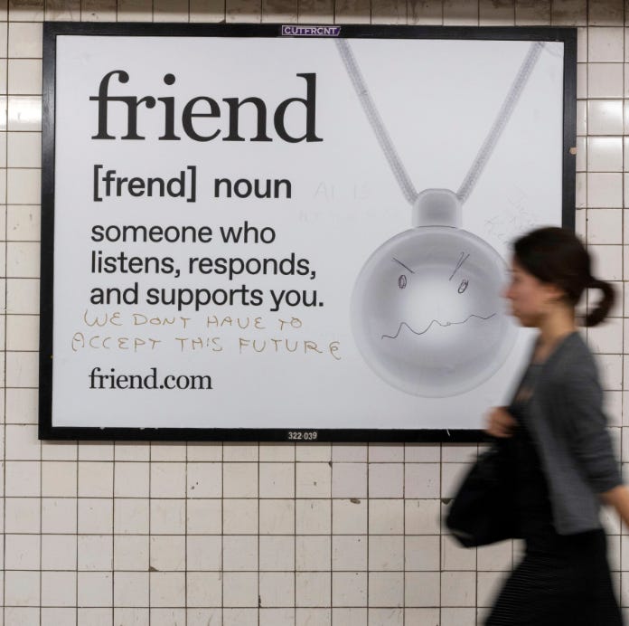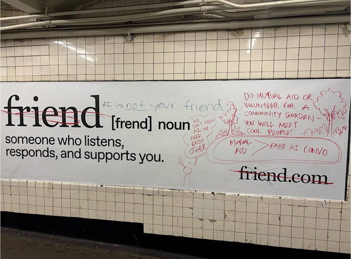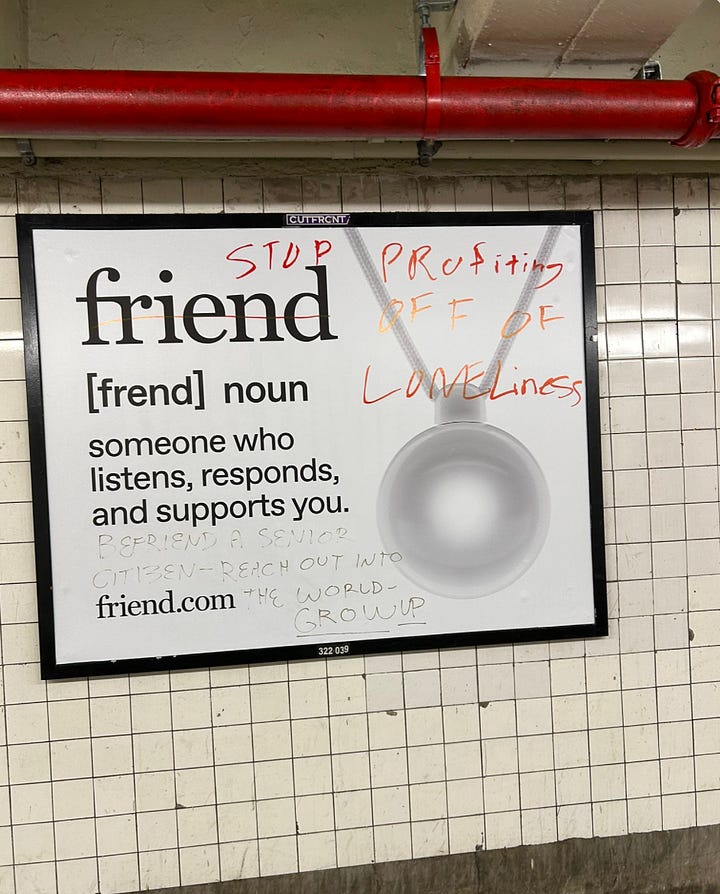 Once you start looking, you notice it everywhere. Even in those billboards, the ones for the stupid AI necklace. Here’s what Avi Schiffmann couldn’t see. Sure, some of the vandals were just trolling him, giving him the kind of viral engagement loop he claims to crave. But people weren’t just scrawling penises and curse words on those godforsaken canvasses. They were reaching out to each other. They were giving instructions. About how to fight loneliness. About how to build a neighborhood. About how to love.